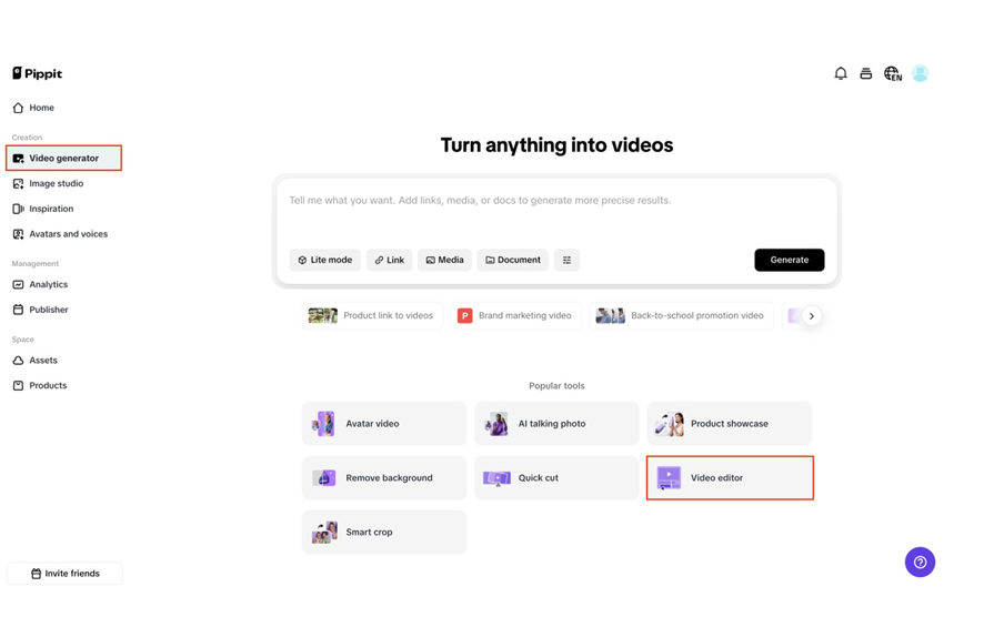 Log into your Pippit account, head to the Video Generator, and select Video Editor. This workspace is where you prep your video before adding lyrics.