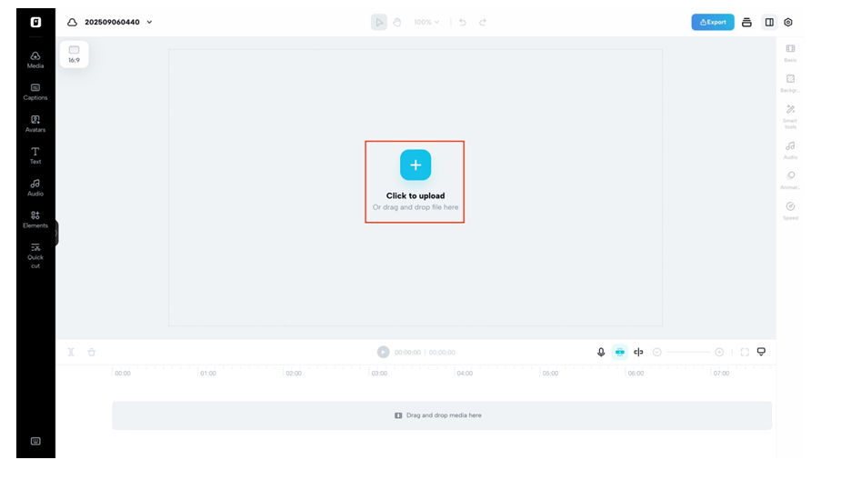 Click Upload in the editor panel or drag and drop your file onto the timeline. You can add videos from your device or cloud storage. Once uploaded, it appears in the timeline with a preview for checking.