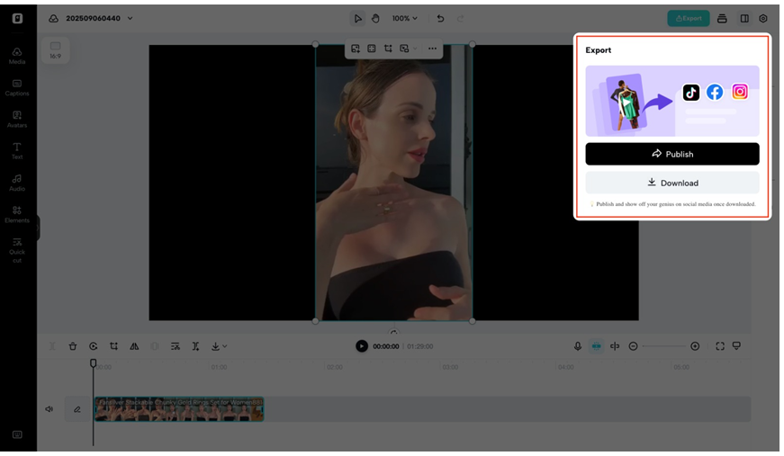 What makes Pippit powerful is that it’s an all-in-one creative hub for musicians. Let’s say your video doesn’t fit TikTok’s vertical frame. Normally, you’d need a separate editor, but here you can simply crop video inside Pippit and format it perfectly for Reels, Shorts, or Stories.